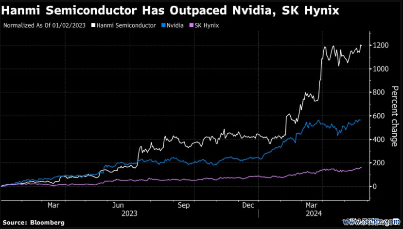 该公司股价狂飙的主要原因是,韩美半导体公司的核心产品TC Bonder踩中了全球AI浪潮,受到了资金爆炒。