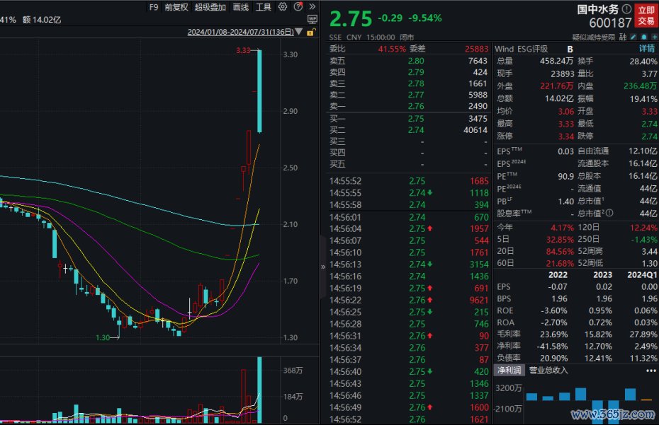 近日7连板的国中水务今日早盘再度涨停,午后大幅下探,一度触及跌停,上演“天地板”走势。收盘下跌9.54%报2.75元。