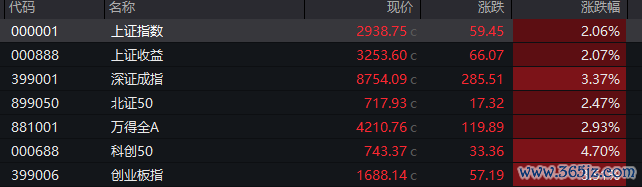 具体来看,A股方面,两市股指高开高走,盘中单边上行,沪指涨超2%,深证成指、创业板指涨超3%,科创50指数涨近5%。截至收盘,沪指涨2.06%报2938.75点,深证成指涨3.37%报8754.09点,创业板指涨3.51%报1688.14点,科创50指数涨4.7%,两市合计成交9033亿元,时隔2个多月重返9000亿上方。